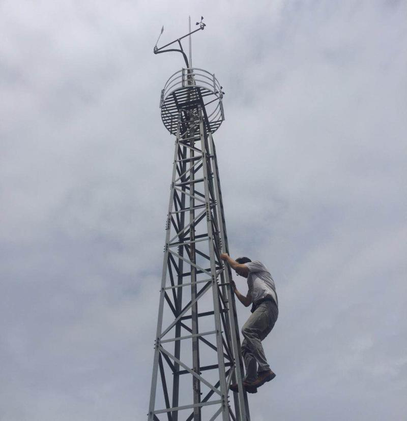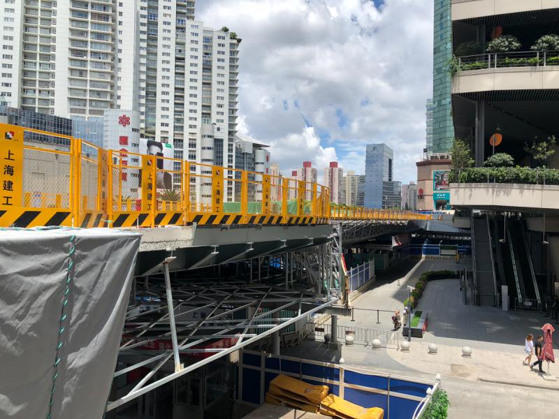 拉菲尔云廊施工现场,两名工人正在对1号灯塔安装斜撑加固,接下去,他们将对施工现场的7个灯塔全部安装斜撑。在另一处施工现场,工人们则在对铝合金杆件进行重装包装,以免台风带来的雨水侵蚀。