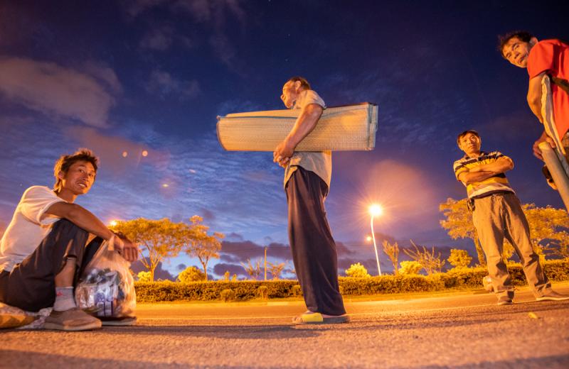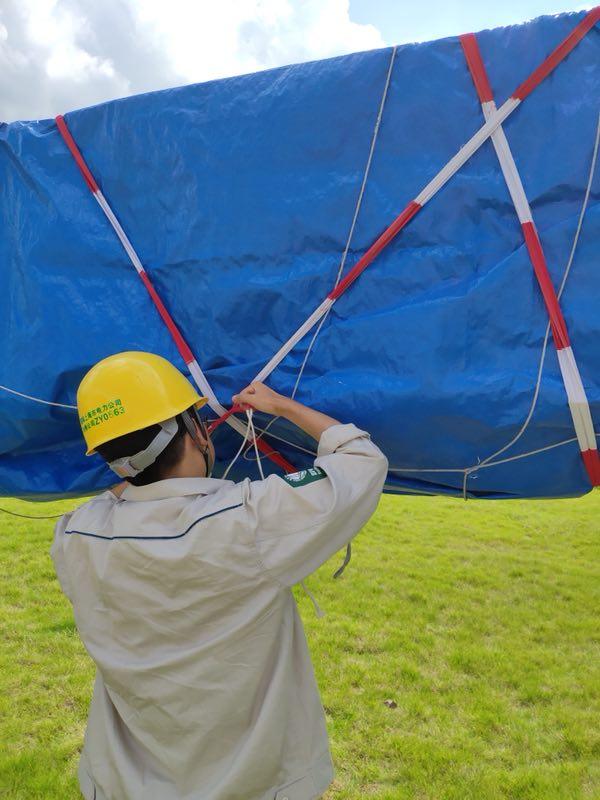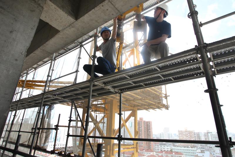 图片说明:拉斐尔云廊工地,建筑工人正在紧箍防台缆风绳。蔡斌 摄
