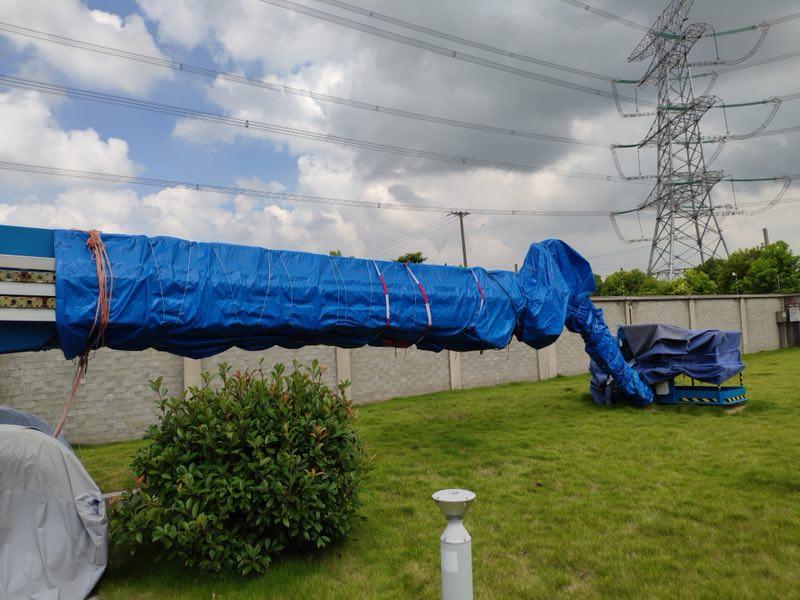 在G60科创走廊,“世界最长的城市产业长廊”拉菲尔云廊目前已进入顶部云廊的高空安装阶段。为了防御台风“安比”,工地上做足了准备。