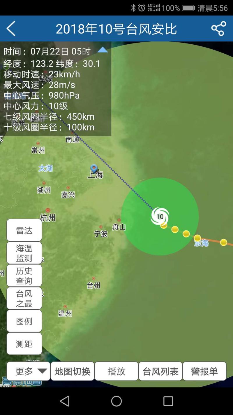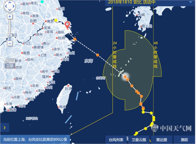 今天早晨5时,安比位于上海东偏南方向大约145公里海面上。中心附近最大风力10级,中心附近最大气压980百帕。预计“安比”将以每小时25公里左右的速度向西北方向移动,穿过舟山群岛,在上海登陆。