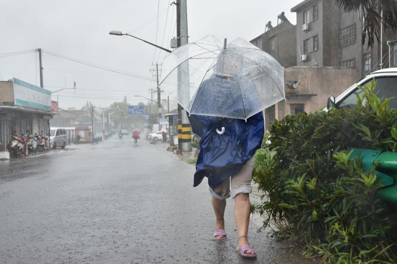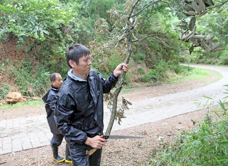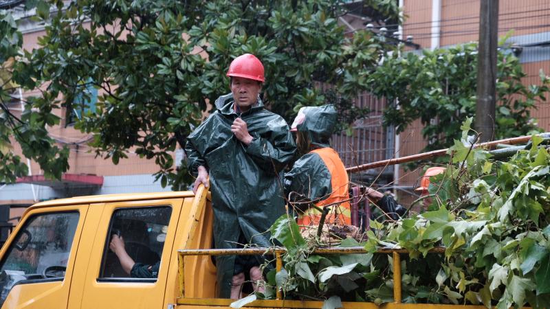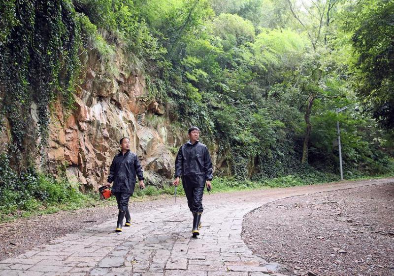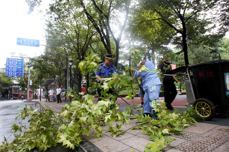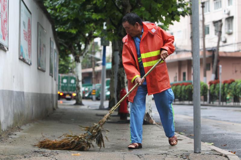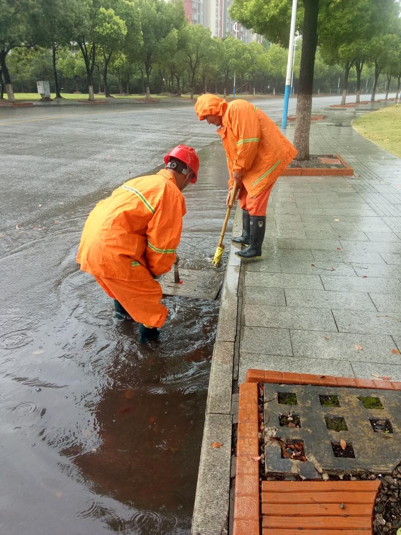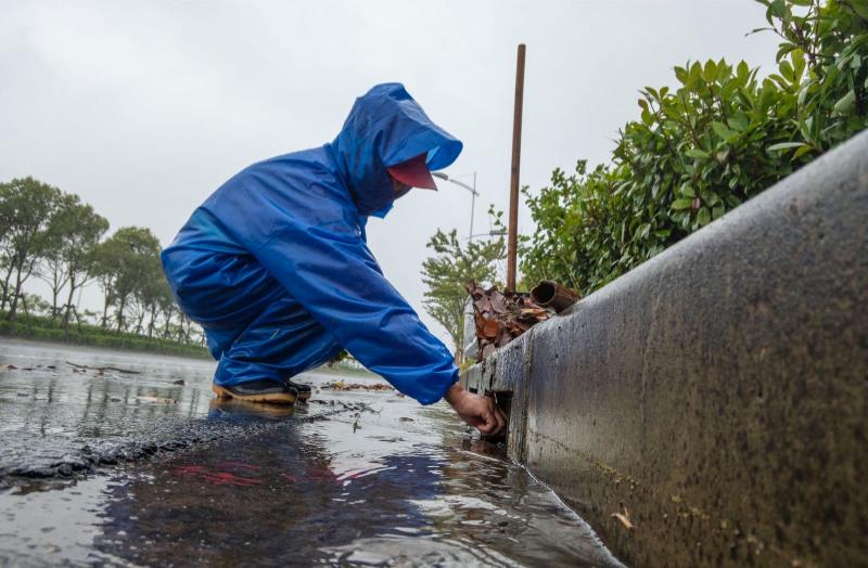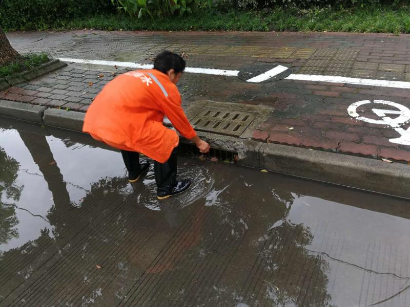 在人民路三沙洪路路口,雨幕让能见度降得极低,来往车辆都打出了双跳灯,以时速20公里左右的速度在路面上缓慢淌行。雨中,一名身穿橙色“环宏保洁”衣服的保洁员在路面上捡拾树枝、树叶等垃圾。“必须及时清理,再大的风雨我们也要出来。如果这些东西不清理,很容易堵塞马路下水道,引起路面积水。”这名顾姓环卫工人告诉记者。