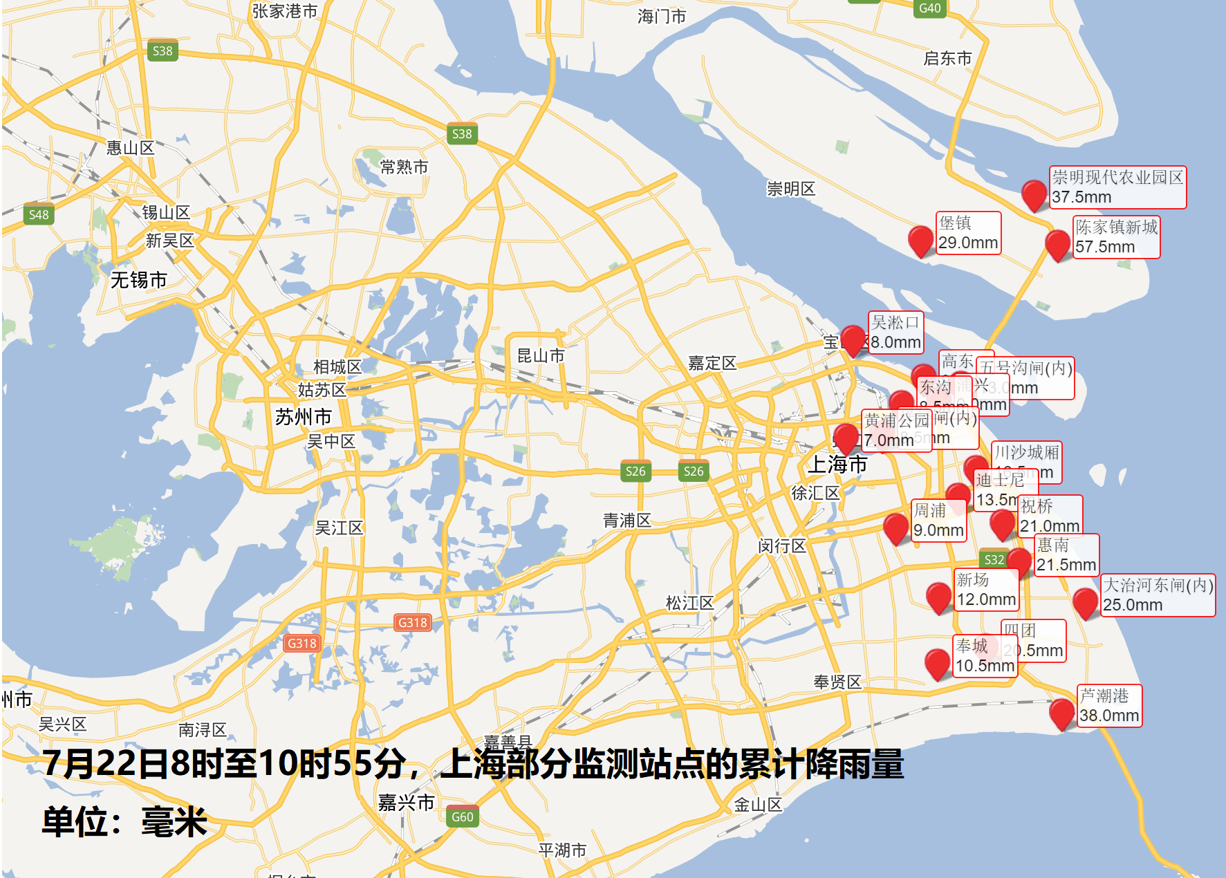 今天0点到16点,上海各区基准观测站中雨量最大的是宝山,79.2毫米,其次是浦东68毫米,自动站中横沙新民112.8毫米最大,最大小时雨强出现在横沙新民,为46.5毫米/时。