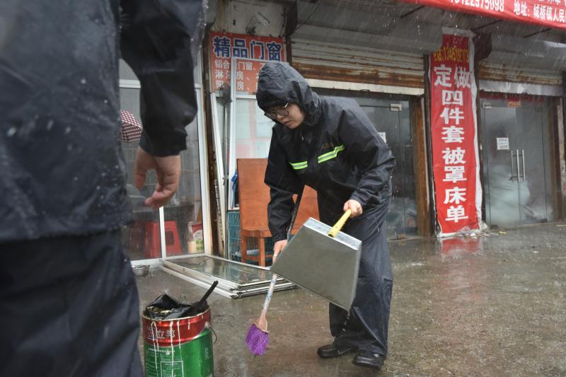 沿着人民路再往东走,不远处一家杂货店的玻璃门被风吹倒,碎玻璃渣在雨中散落一地,现场有几名年轻人穿着雨衣雨裤、拿着扫把簸箕在帮店主清扫碎玻璃。“这么大雨,清扫玻璃要注意安全,有人受伤吗?”陶敏敏问。“没人受伤,但碎玻璃总要及时清扫,不然着急赶路的人很容易踩到。”记者了解到,帮店主清扫碎玻璃的是崇明供销社下属饮食服务公司书记江思佳一行人。