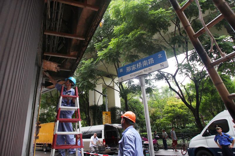 在杨浦五角场创智天地,吊车的长臂升上高空,拖起一个巨型的店招,缓缓降下。“台风天里,一些户外广告、摆放在窗台的花盆、衣物都有可能成为安全隐患。”现场施工人员表示,尤其是一些老旧的店招,多年来受风吹日晒雨淋,里面木质结构的部分出现了腐烂的状况,台风过境时容易坠落伤人。