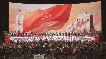 随后上演的新时代版《长征组歌》成为本场演出的核心。 下转 5版(上接第1版)这部由萧华作词,晨耕、生茂、唐诃、遇秋作曲的红色经典,分为《告别》《突破封锁线》《遵义会议放光辉》《四渡赤水出奇兵》《飞越大渡河》《过雪山草地》《到吴起镇》《祝捷》《报喜》《大会师》十个段落,全景再现了长征途中艰苦卓绝的战斗历程与红军将士英勇乐观的革命情怀。