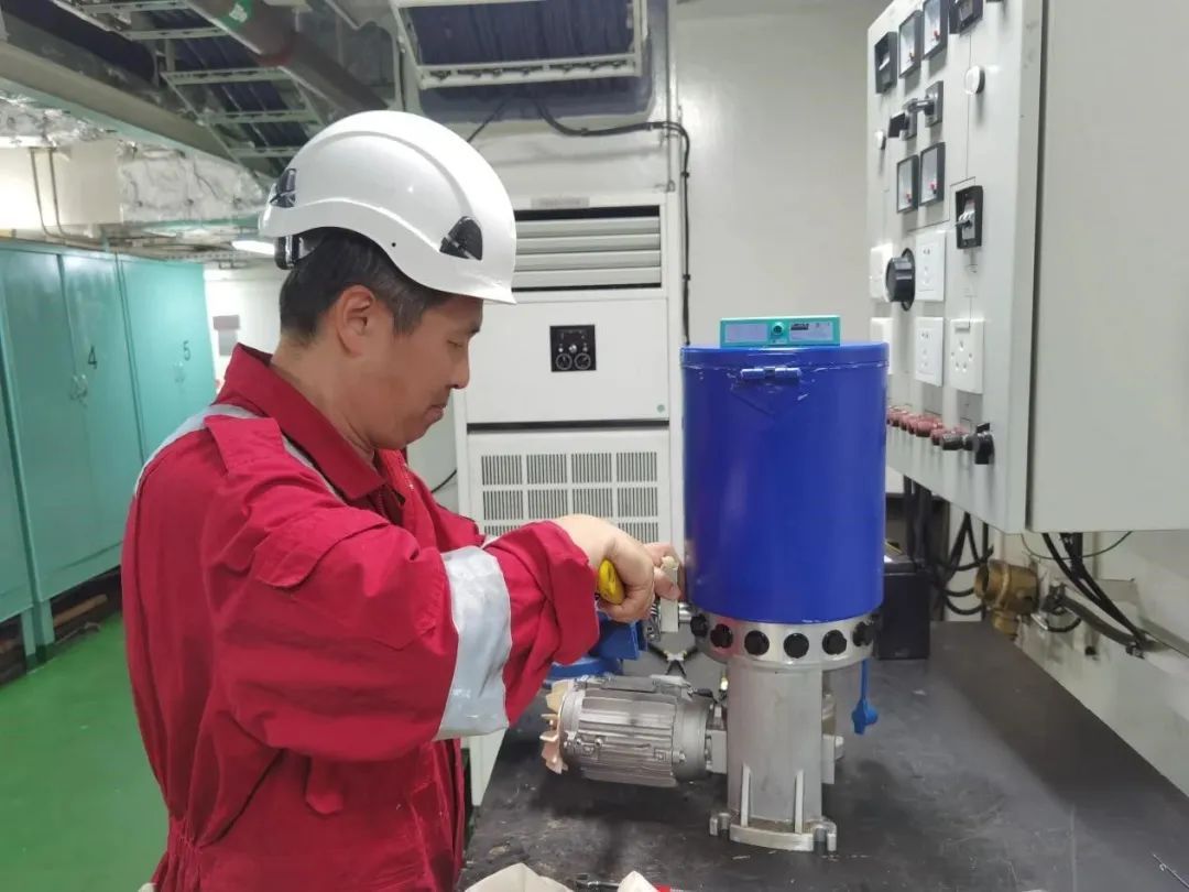 李国祥对“雪龙2”号机舱设备进行维护保养