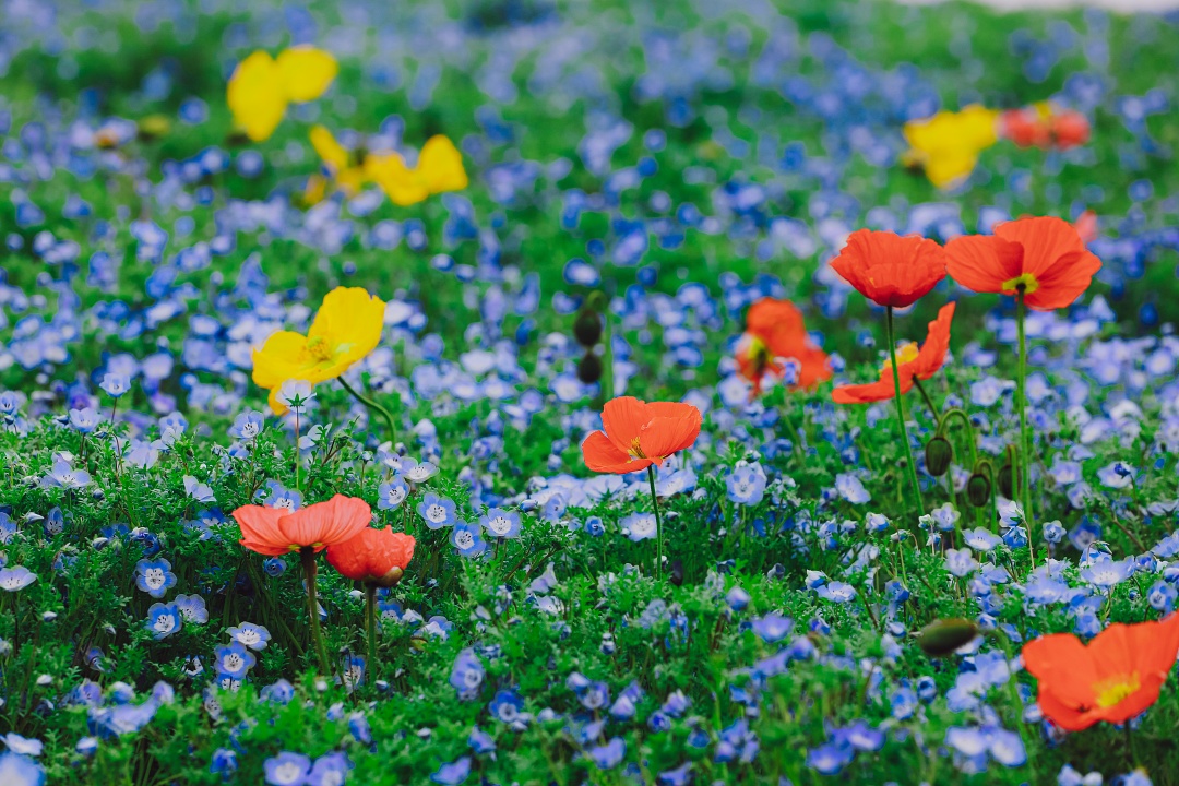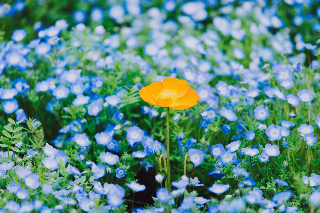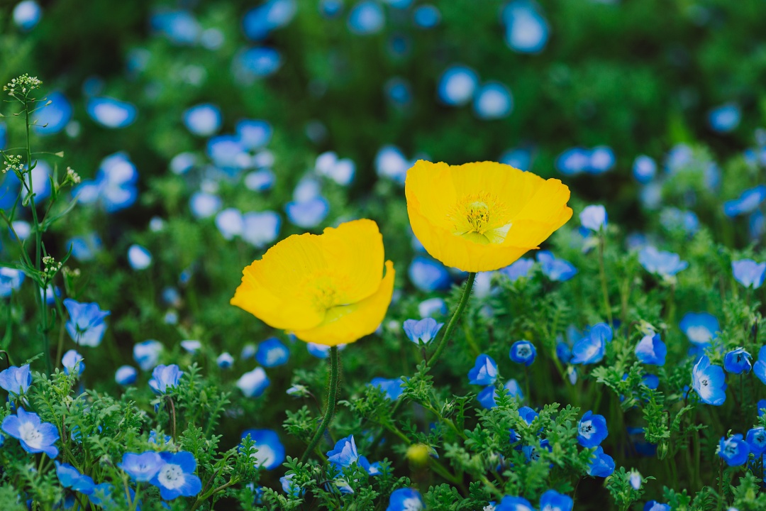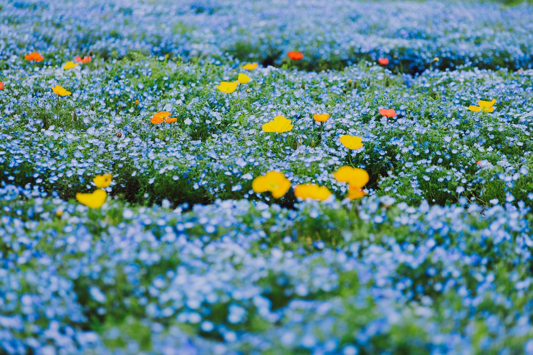 那一片纯净的蓝,点缀着黄色、红色及白色的虞美人,像是落入蓝色星海中的红黄宝石。