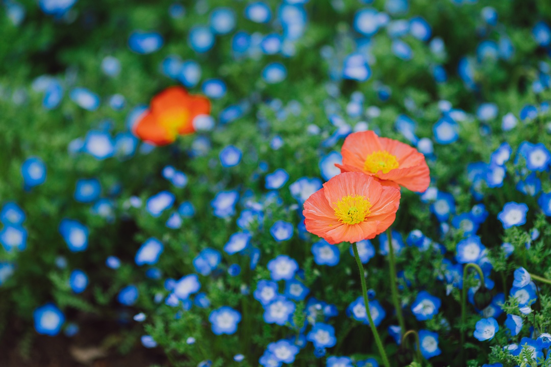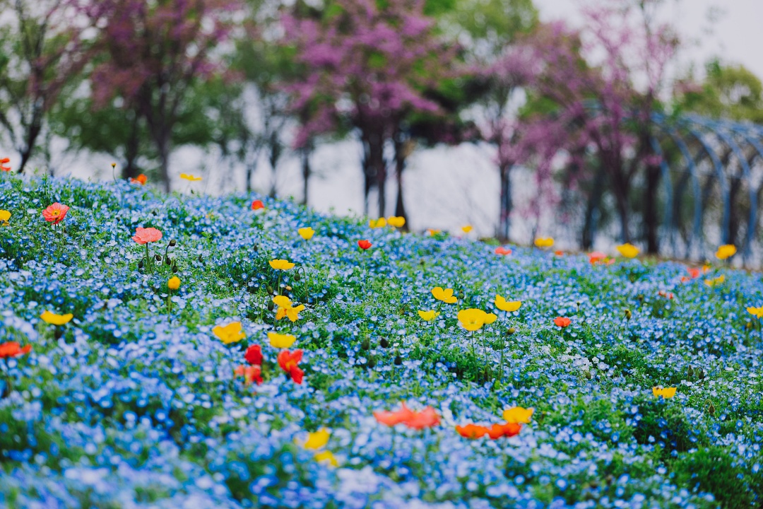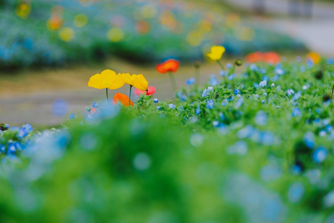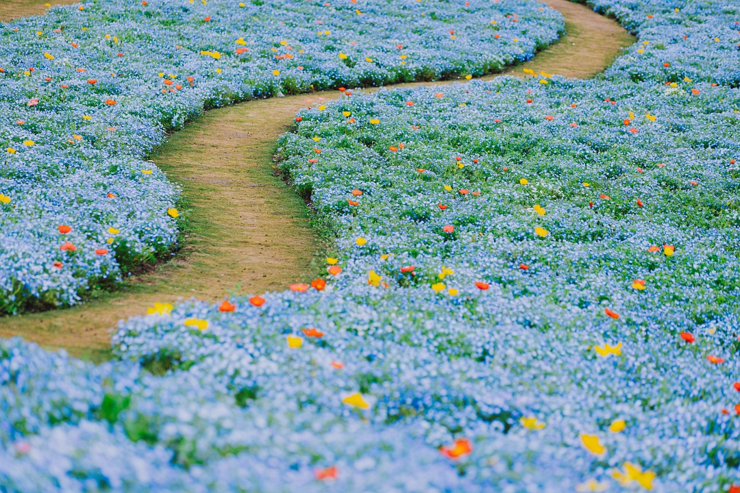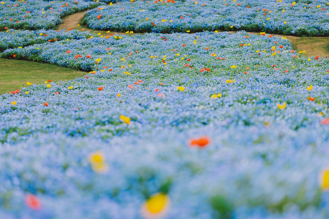那一片纯净的蓝,点缀着黄色、红色及白色的虞美人,像是落入蓝色星海中的红黄宝石。