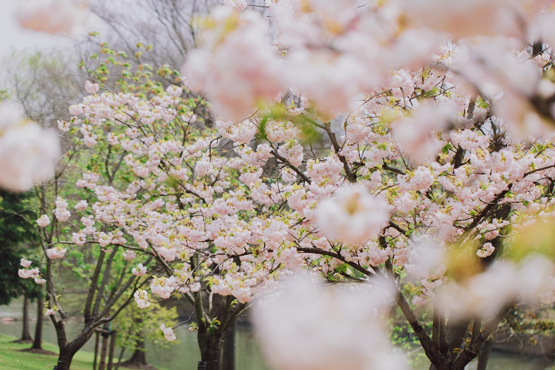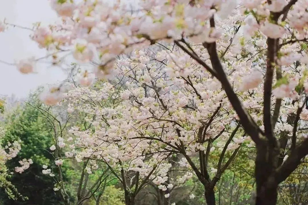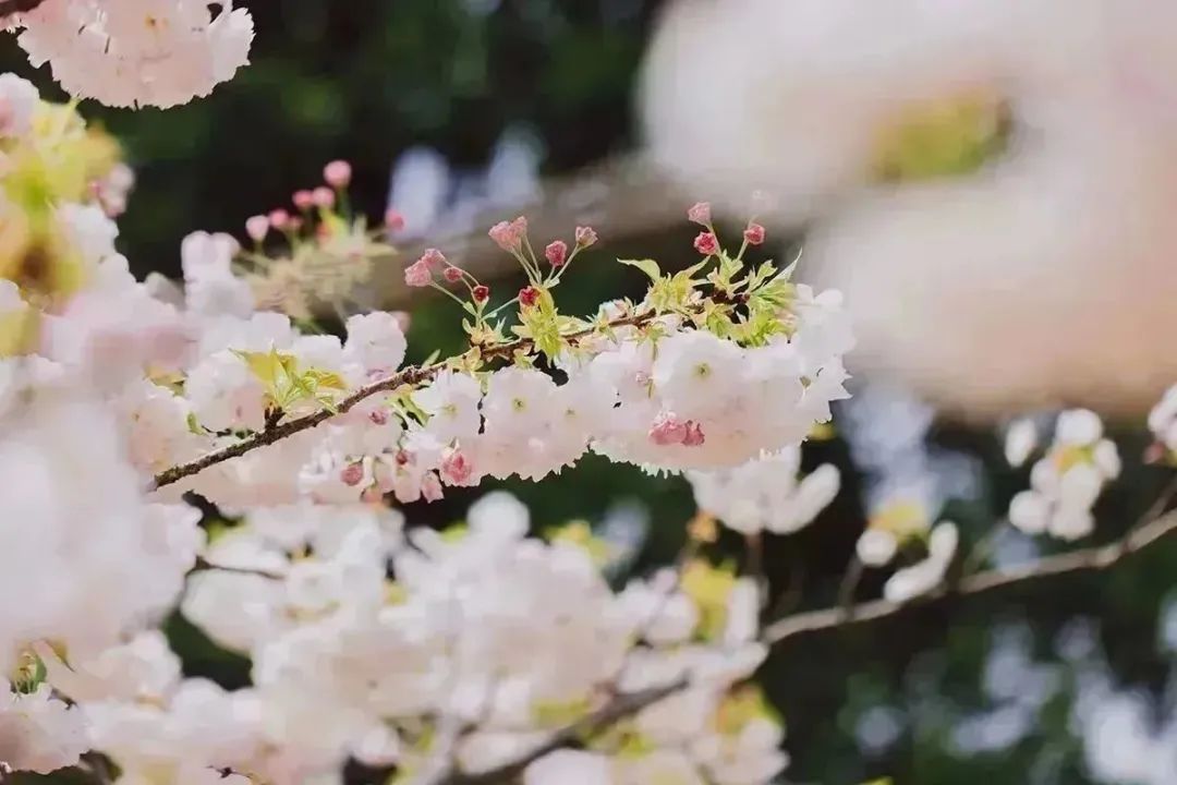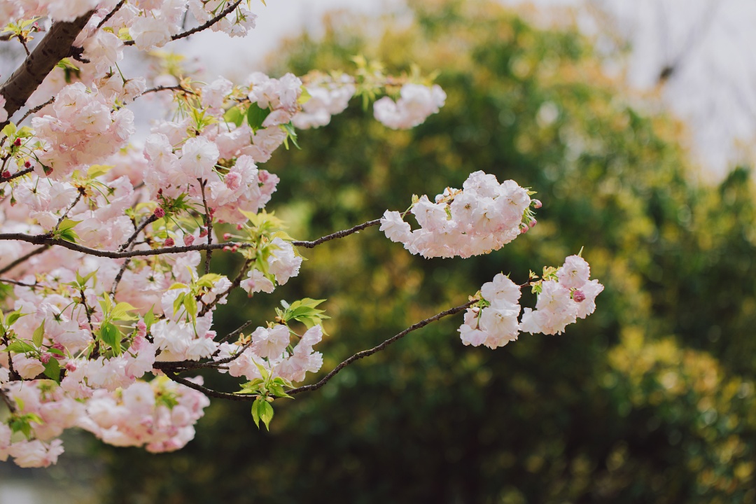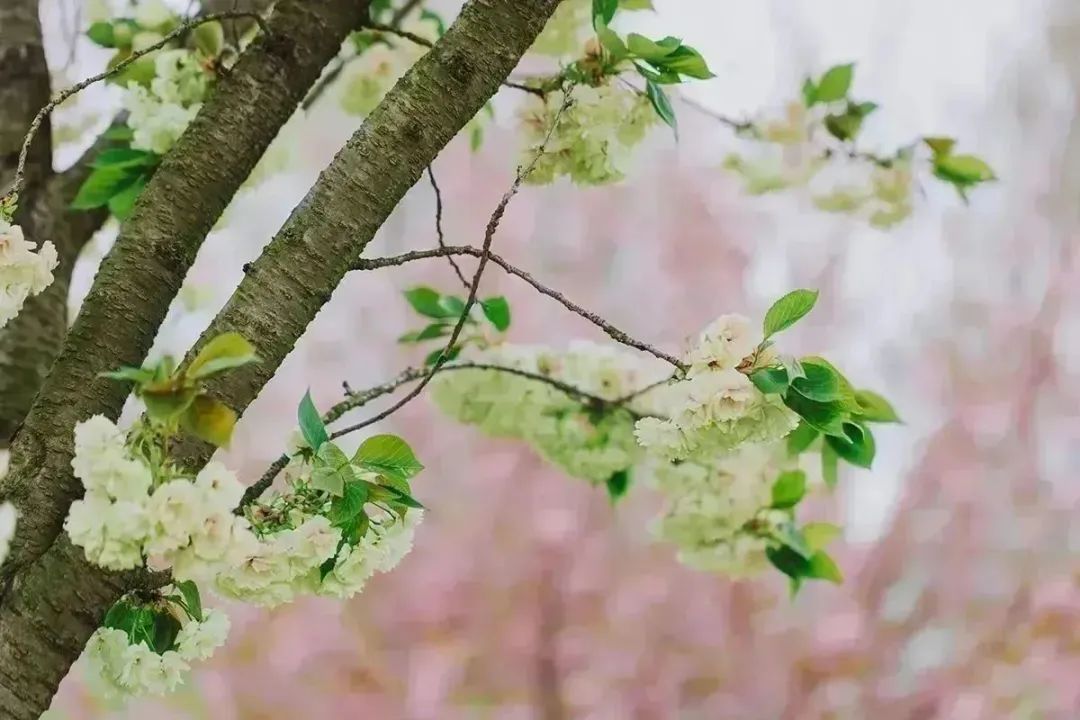 比起早樱、中樱们的清雅秀丽,晚樱的花朵们往往热闹地簇拥在一起,像颗颗花球缀在枝头,喜骄阳更无惧风雨,开得肆意而浪漫。眼下,辰山植物园内纯白、浅粉、深粉、浅绿各色晚樱接力登场,吟颂着春意的美好。
