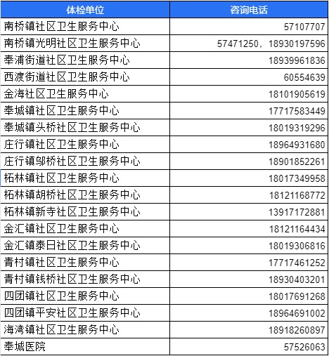 奉贤区内60周岁及以上户籍老年人每年均可免费享有一次健康体检。奉贤区各社区卫生服务中心均可参与老年体检项目,详情可咨询所在地社区卫生服务中心。(即日起,居民可根据村居委通知集中前往,也可以拨打以下咨询电话,自行前往。)