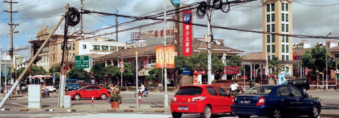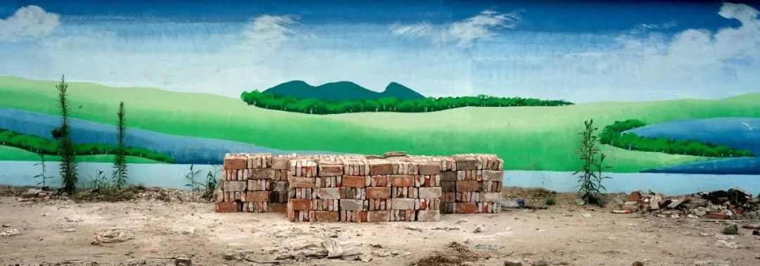 刚开始,朱锋会用黑白胶卷拍下路过的萧条景象。随着时间的推移,那些满是荒草的地块,开始被围墙圈起,围墙外竖起了巨大的广告牌,上面开始变换着各类彩色的房地产广告,很快这里建起高楼,夜晚灯火通明。他决定用彩色胶卷和宽幅的形式来呈现眼前的景象,以真实的人或物件为前景,这样便产生了一种真实与虚幻的反差感。