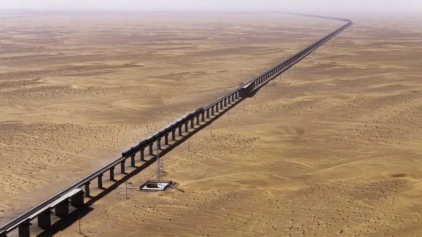 和若铁路全长825公里,西起新疆和田地区和田市,东至巴音郭楞蒙古自治州若羌县。它与现有的格库铁路、喀和铁路、南疆铁路连通,环绕塔克拉玛干沙漠一周,形成了世界首条环沙漠铁路线。