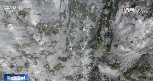 重庆武隆,渝怀铁路上方,几百米高的山体被脚手架包围,许多建设者在垂直的峭壁上作业,为危岩体增设防护设施。脚下是悬崖,耳畔是狂风,一吊就是五六小时。