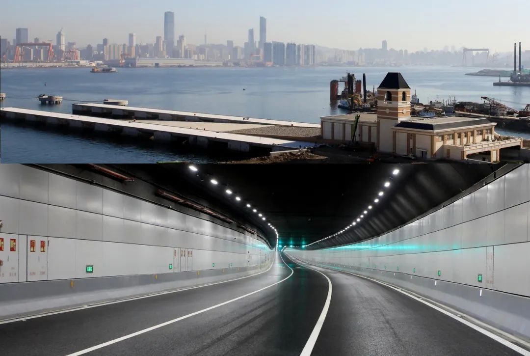 △大连湾海底隧道北出入口(上图)与海底沉管行车道(下图)。
