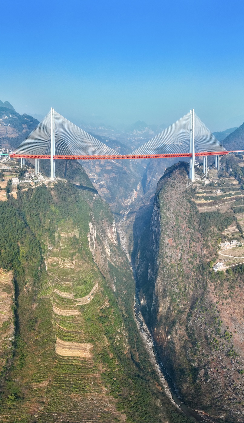 北盘江第一桥屹立于北盘江大峡谷之巅,全长1300多米,连接云贵两省。从桥面到谷底水面,高度达到565米,因此成为世界第一高桥。