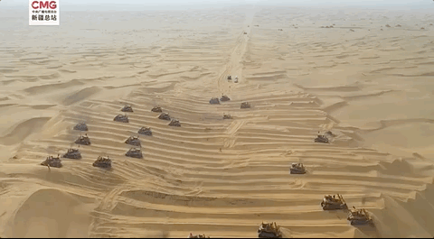 塔克拉玛干沙漠腹地,塔中沙漠公路施工现场,建设者们平沙山、战荒野,操纵着30余台大型推土机正在高大的沙山中纵横往返,将巨大的流动沙丘依次推平成路基。