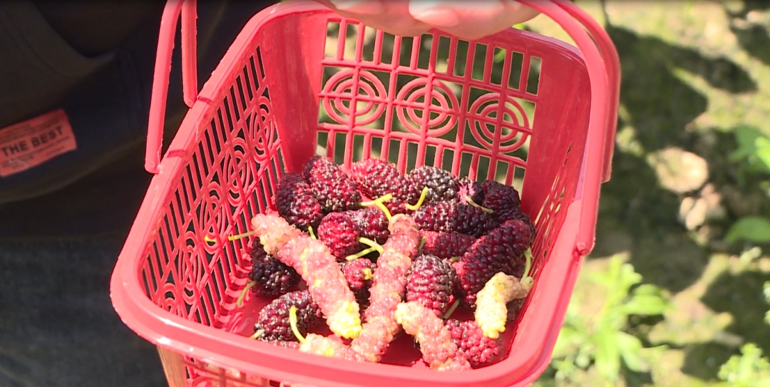 在种植园里,大片绿油油的桑葚树上,一串串红中带紫的桑果像黑宝石般镶满了枝头,散发着诱人的香气,让人垂涎欲滴,空气里也弥漫着桑葚的阵阵果香。由于近几日气温上升,桑葚也进入快速成熟期,工人们正提着果篮穿梭其中,一番熟练的操作下,饱满肥硕的桑葚很快便装满了整个箩筐。