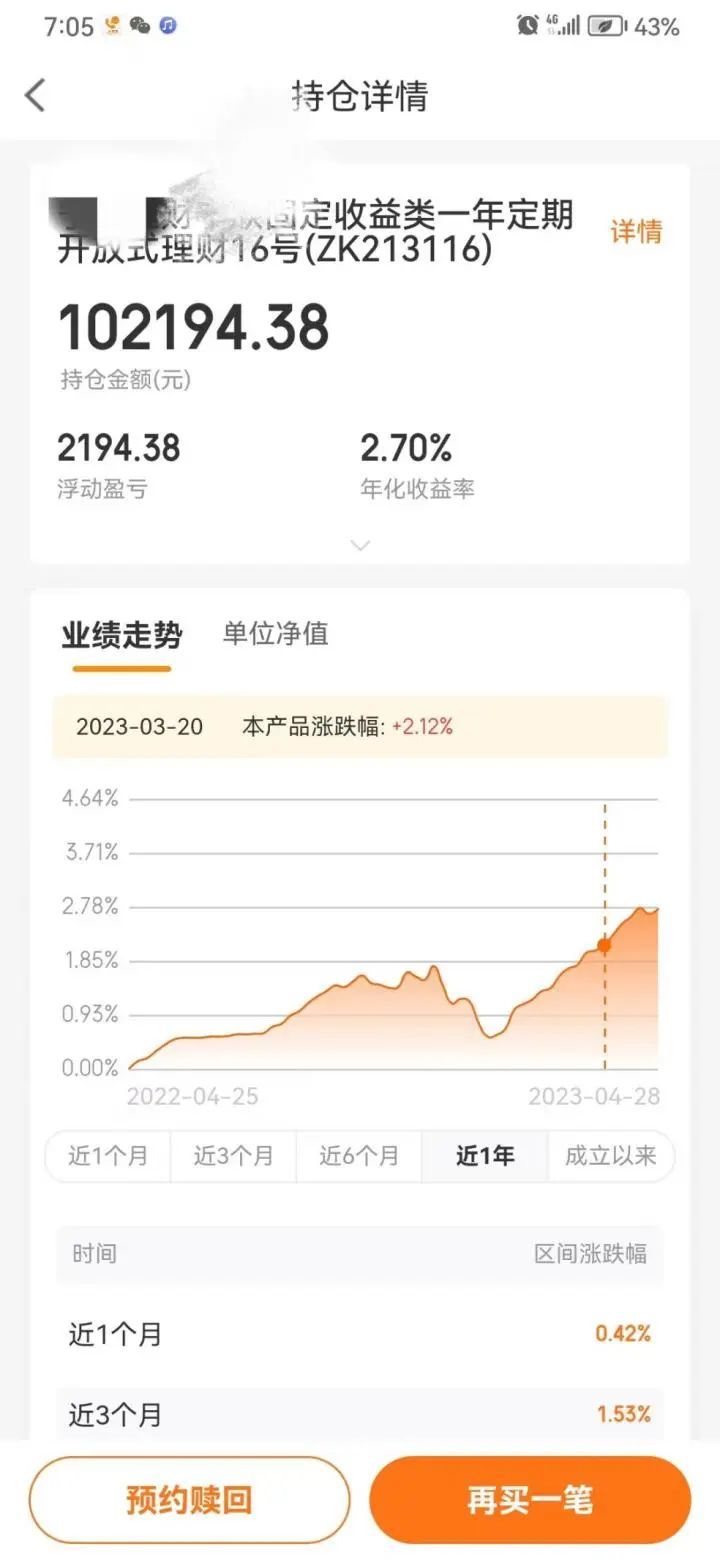 王女士告诉记者,之前也买过股票、基金,都是亏损出局,亏了几万之后,再也不玩了,只敢配置稳健点的银行存款产品。一年前,她还买了一款银行理财产品,总计10万元,但是没想到理财产品也曾一度出现过亏损,目前已经回上来了,这个月底到期,目前来看,快一年了,收益2.7%左右,她觉得也不是很安稳,到期后也打算不做理财产品了。