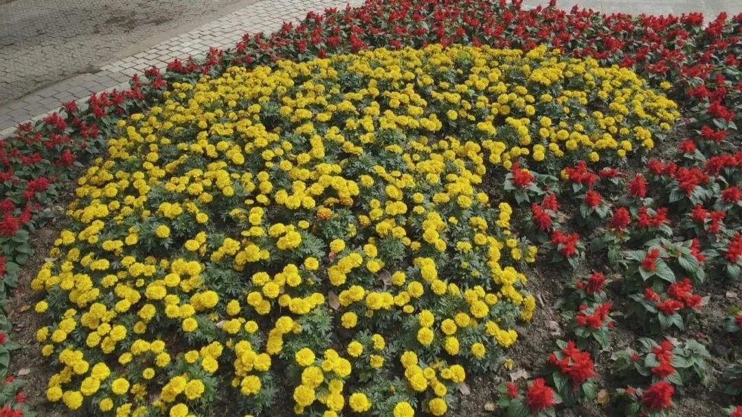 除了龙胜路之外,金一东路沪杭公路交叉口的月亮湾花园的一串红以及孔雀草也迎来了开放季。据悉,月亮湾花园面积三千余平方米,数千盆红黄相间的花卉围绕中心圆环有序排开,组成爱心的形状。不少市民坐在长椅上,边赏花边聊天。