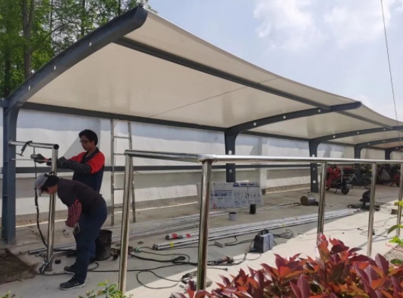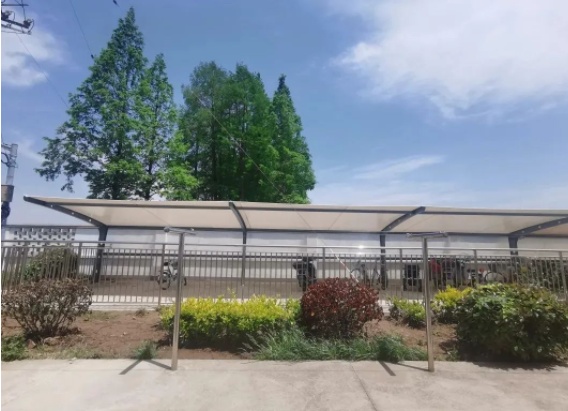 说干就干,清除选址附近的杂草、铺设水泥地、设计排水消防系统、敷设电线……经过为期一个多月的紧张施工,一体式车棚落地建成。