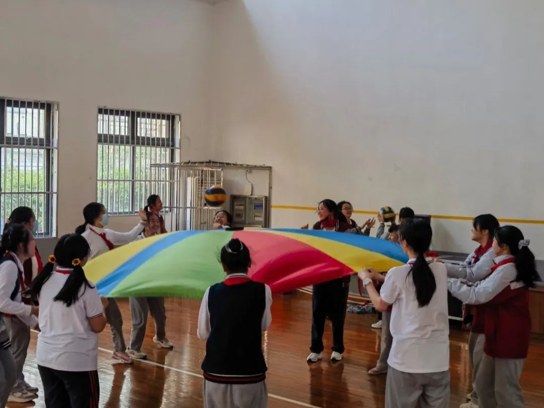 共同前行,一起“运转乾坤球”;团结一致,齐心敲响“同心鼓”;“巨型排球赛”更是“位育人人懂排球、人人会打排球”最好的诠释,也是排球文化最好的传承和接力。“蜈蚣行走”“珠行千里”“奋勇前行”……“彩虹伞”下阳光般的笑容绽放在学生脸上,让他们充分感受运动带来的快乐及魅力。