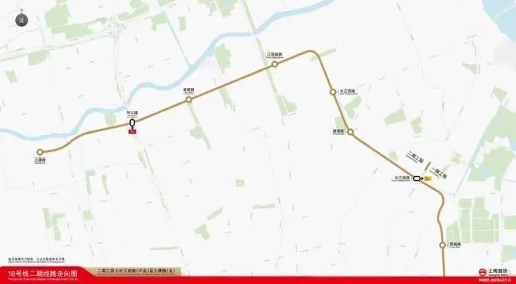 在建18号线二期位于宝山区,从线路走向示意图上看,18号线二期其实是18号线一期的“西延伸”。其起点位于一期的终点站长江南路站,一直向西通到宝山庙行地区,至大康路站。