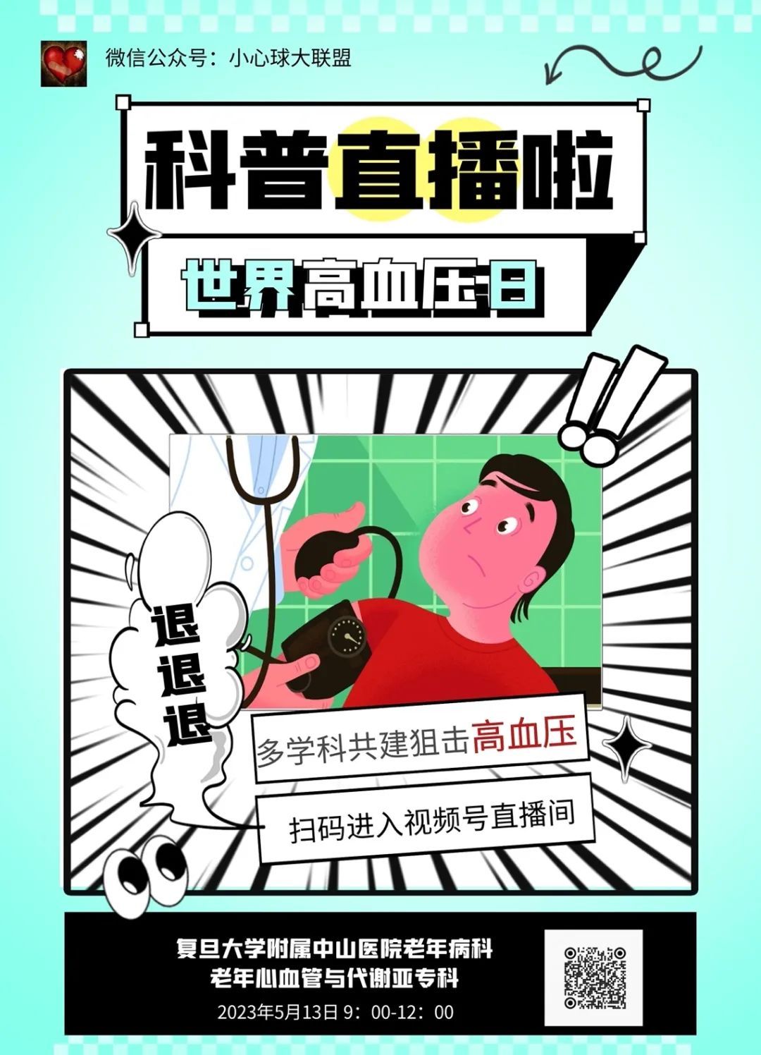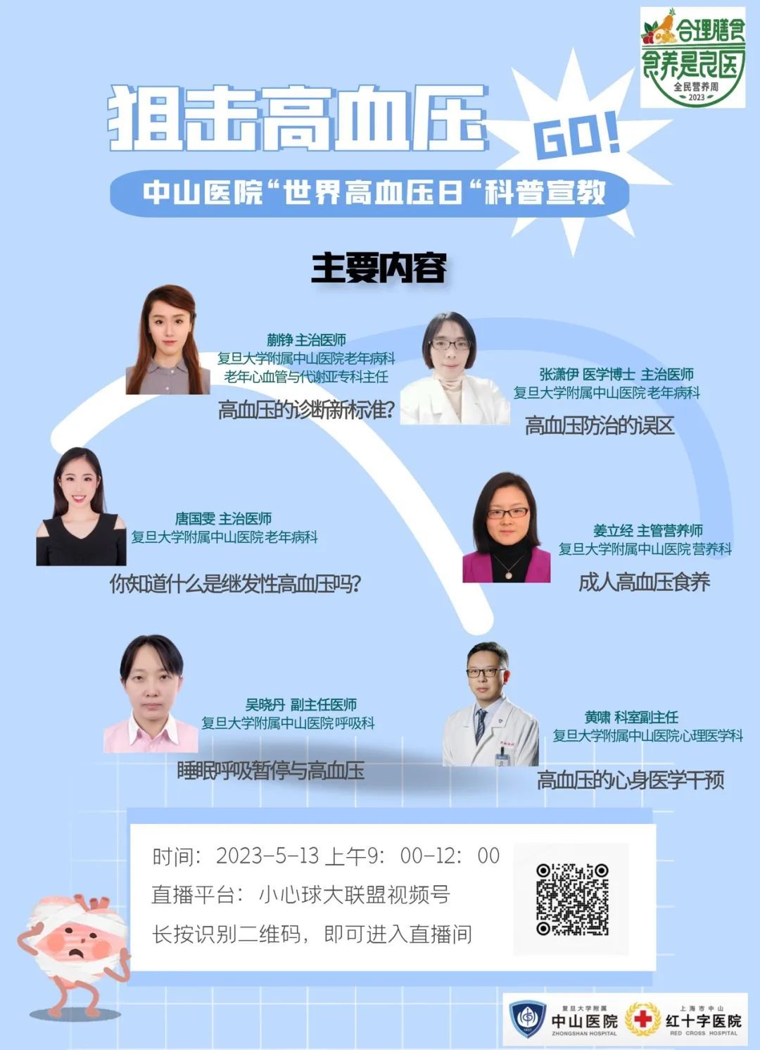 每年5/17是世界高血压日,在今年的高血压日来临之际,复旦大学附属中山医院老年病科老年心血管及代谢亚专科团队联合呼吸科、心理医学科及营养科的专家在本周六开启线上科普直播活动,引导公众正确认识高血压、帮助高血压病人及家属破除高血压误区,精准治疗,早期达标。