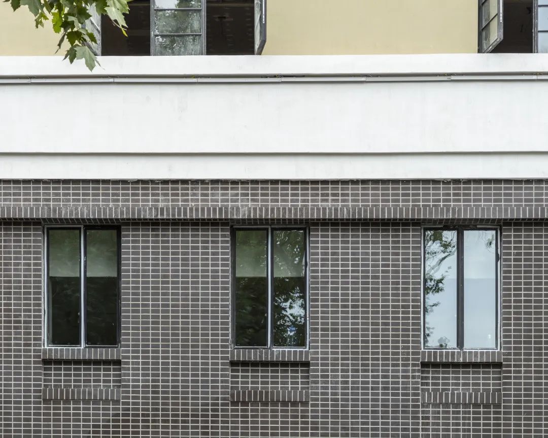 在外立面修缮中,设计恢复了墙面的大面深色水刷石和局部浅色水刷石,同时一、二层立面恢复黑色小方砖的历史材质,恢复腰线、雨篷及门头的浅色斩假石,从而完整地展现历史建筑的厚重感和沧桑感。