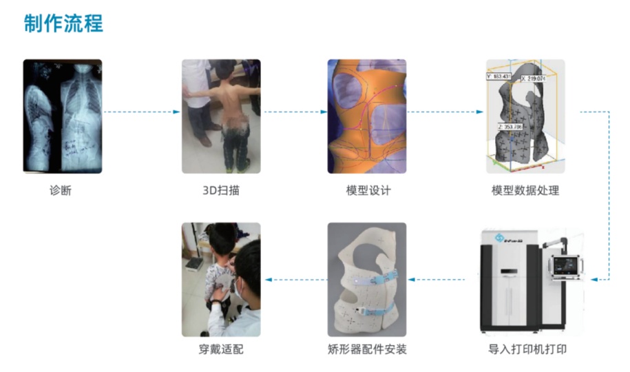 3D打印技术结合患者影像特征与临床表现,对患处骨骼进行计算机三维扫描、数据建模,制作与患者病情最匹配的矫形器。个性化设计保证支具能够完全匹配患者,固定更稳固。