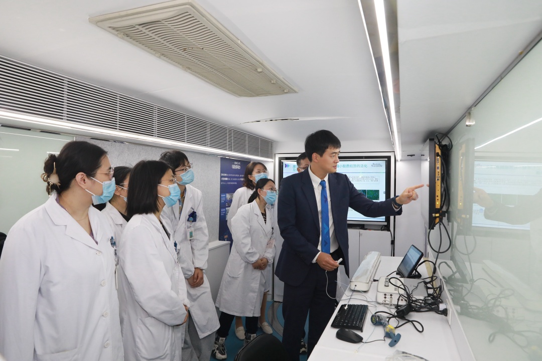 大巴上,来自复旦大学附属金山医院的专家正在为社区全科医生讲解与操作演示下肢动脉腔内手术治疗模拟器。此次对于全科医生的培训以及案例分析,也进一步加强了社区对糖足的诊疗和康复的治疗能力。