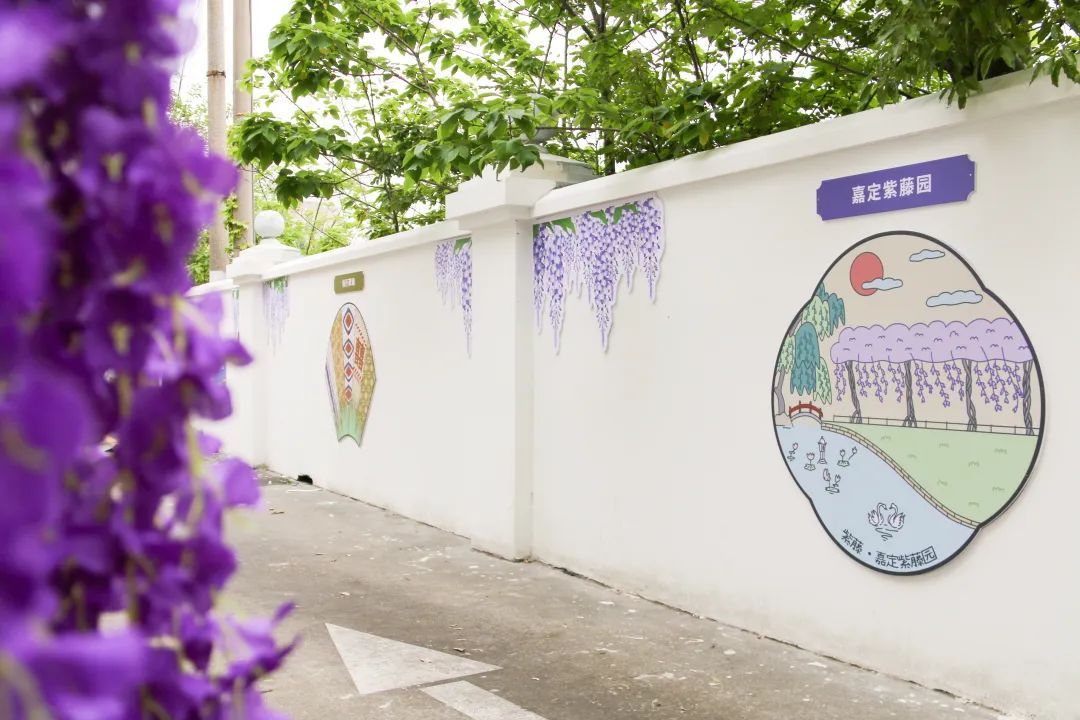 记者在嘉戬紫藤花主题加能站看到,立柱上的紫藤花、建筑上的紫藤廊架,到处充满着紫藤元素,围墙上的嘉定标志性建筑插画也彰显嘉定文化。