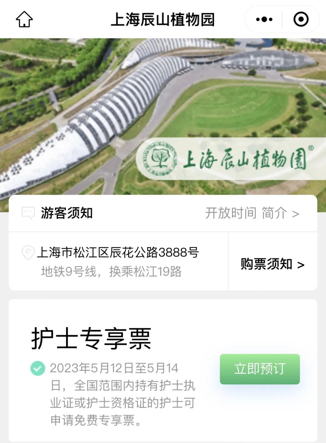 在辰山植物园官方微信公众号预约免费的护士专享票,检票时需出示有效证件及门票进行核验。
