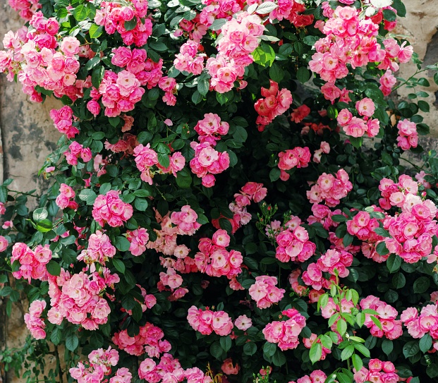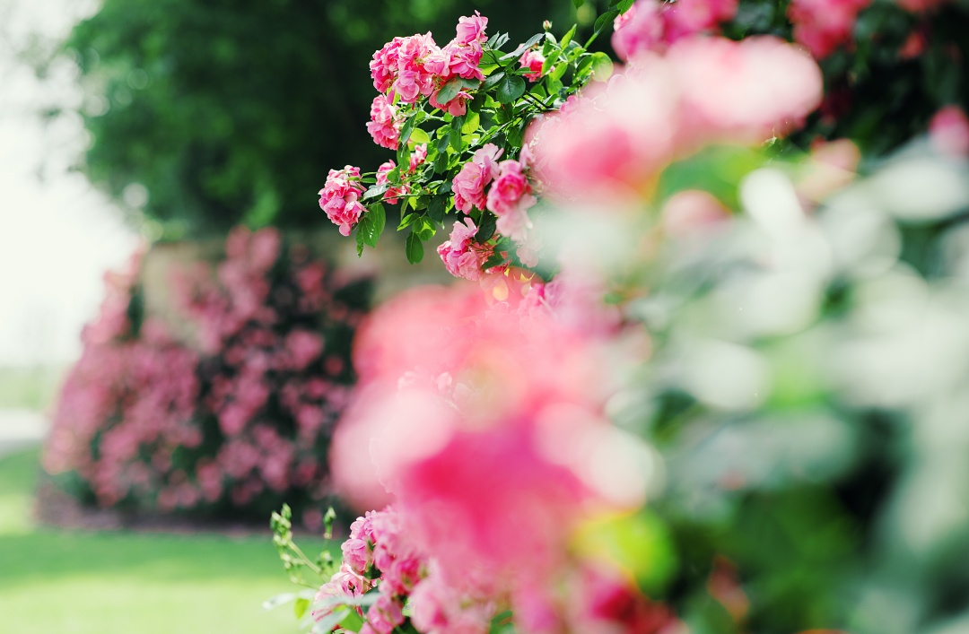 藤本月季中最经典的品种之一,拥有粉红的花色和丰花的特性。辰山植物园内的‘安吉拉’月季均属粉红色花,花瓣呈娇艳的桃花粉色,带有温和的果香,花朵娇小玲珑,惹人怜爱,就像“月季中的小公主”。安吉拉单只花朵虽娇小,它的花量却很惊人,一开就是满头花,很容易开成铺天盖地的粉色花海。而且它爱攀援,在园林中多用于攀附各式通风良好的架、廊之上,形成花柱、花球、花海、花墙、走廊、拱门等景观。