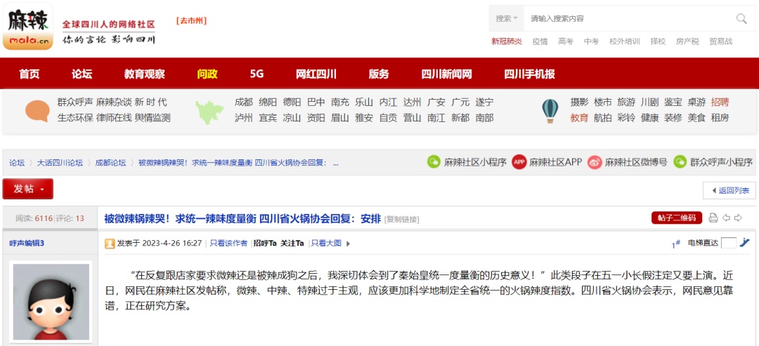 网友建言,为避免以辣味噱头的网红店被游客误认为成都火锅的代表,成都应该率先跳出一味求辣,推广“辣度”标识,形成新的行业规范,提供火锅饮食文化的新尺度。不少网友跟帖表示:“赞同!”“外地人确实很需要。”