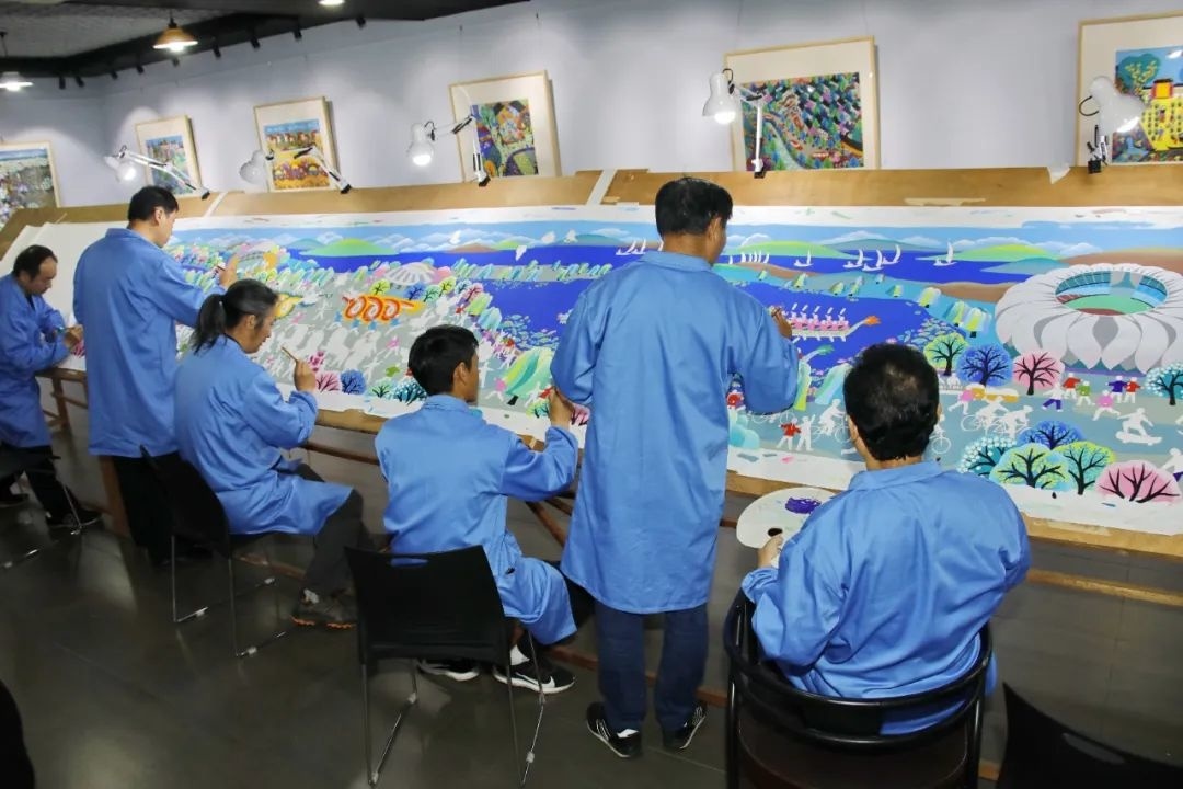 “水墨江南 缤纷亚运 共赢未来”在展现亚运风采,讲好亚运故事的同时,还要保留金山农民画的特色。为此,6位创作人员反复修改线稿,打磨细节,最终绘制了三潭印月、苏堤、白堤、断桥等西湖美景,乒乓球、田径、曲棍球、排球等体育赛事,舞龙舞狮、太极拳、扇子舞、放风筝等健身项目以及大莲花体育馆等。
