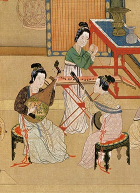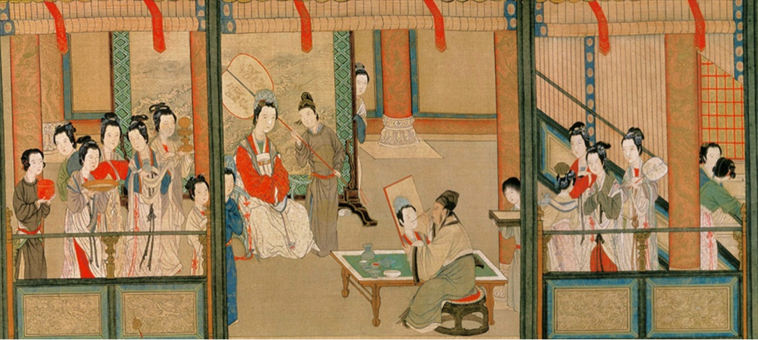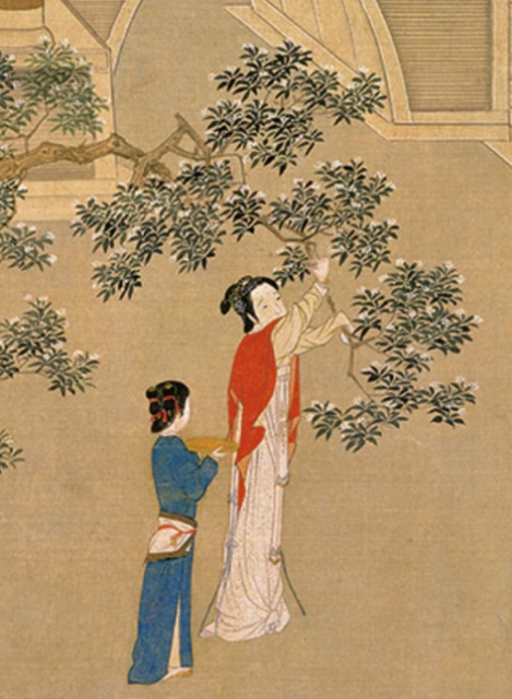 此外,李广雁提及,宫廷画不同于山水画,连绵的宫殿群建筑会使画作变得单调。为了解决这个问题,仇英设计了湖石、池水、树木等盆景在院子中穿插点缀,使得宫廷之中的连续建筑不会有“过满”的感觉。在画卷中对宫院内景观做如此刻意的归置,可以更好地发挥盆景“无声的诗、立体的画、萦绕的音符”的作用。从这种合理的刻意性中,读者可体会到仇英对构图和意境的追求。同时,这样也使得观者能够对画作有更全面地把握,更易将视线集中的人物身上。