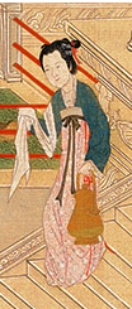 体态纤细轻盈,脸颊圆浑,下颌尖削,峨眉横卧,正是典型的明清鹅蛋脸仕女形象。再搭配上具有宫廷特色的服饰和发饰,俨然构成了一幅明代后宫的“时尚画报”。透过这幅“时尚画报”,我们能窥见那个时代的社会风貌。