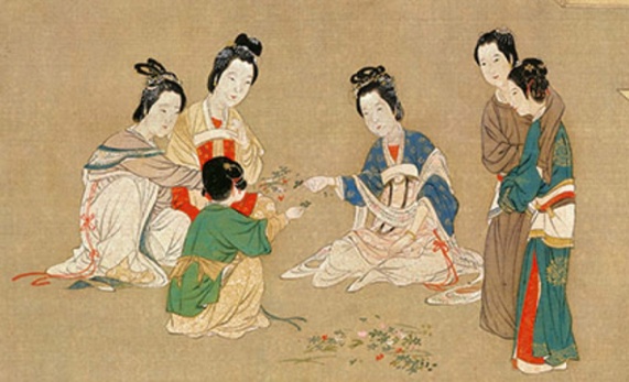 《汉宫春晓图》中女子的发髻高度适中,形式多样;发髻上的点缀以金箔、玉珠、花钿为主,这并不是汉代仕女的发髻样式,更倾向于唐宋时期的风格。