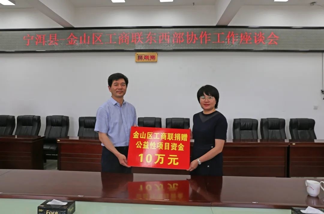 5月11日,在宁洱县-金山区工商联东西部协作工作座谈会上,区工商联捐赠帮扶资金10万元,用于宁洱县黎明乡团山村“阳光服务”公益项目。