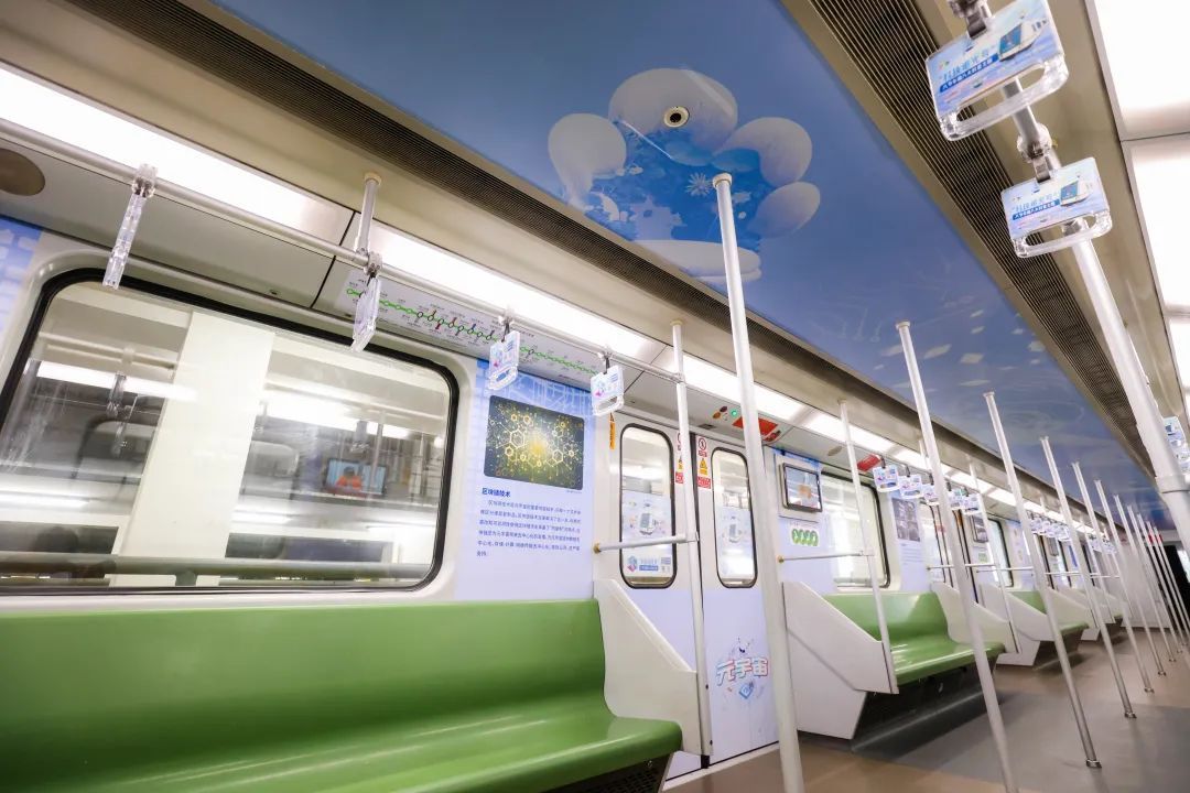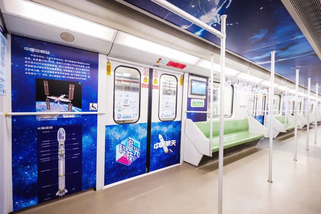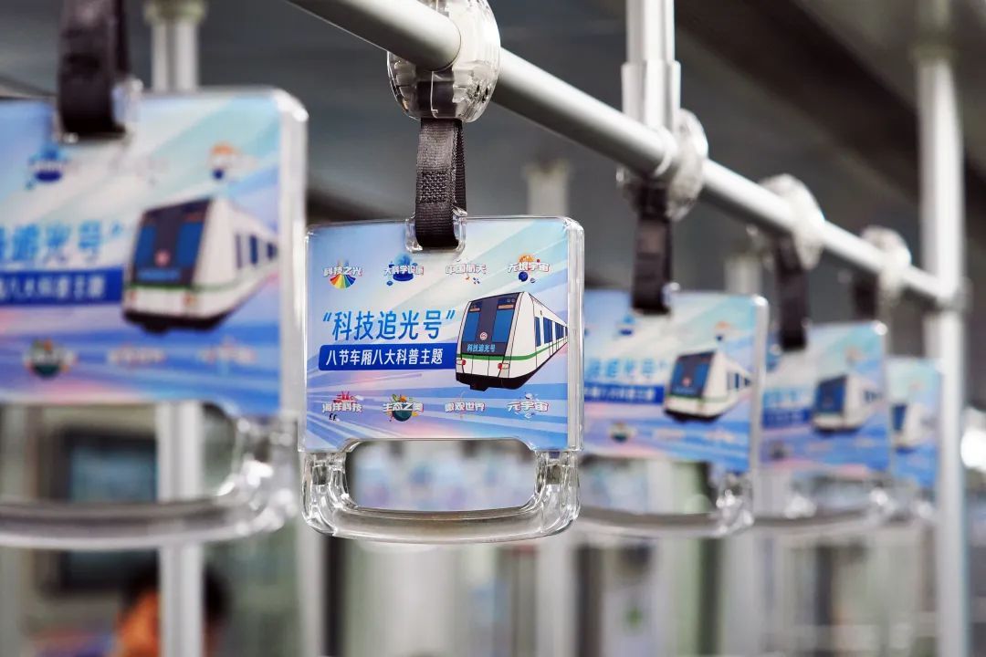 “科技追光号”主题列车,期待公众可以跟随内容追逐科技的光芒,感悟科技的力量,车厢主题特色鲜明。
