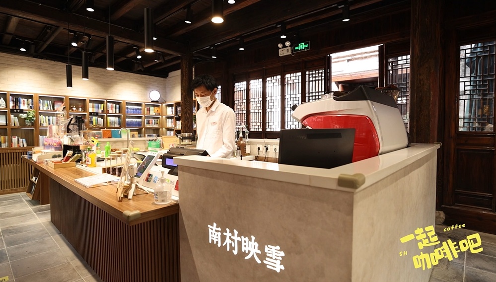 “南村”取自元代大学者陶宗仪所居住之地南村草堂,“映雪”则取自元代泗泾藏书家孙道明书斋映雪斋。“南村”“映雪”的组合,将两位大师珠联璧合,构成了富有诗意的书店名。南村映雪磨辰光咖啡馆便在此处。