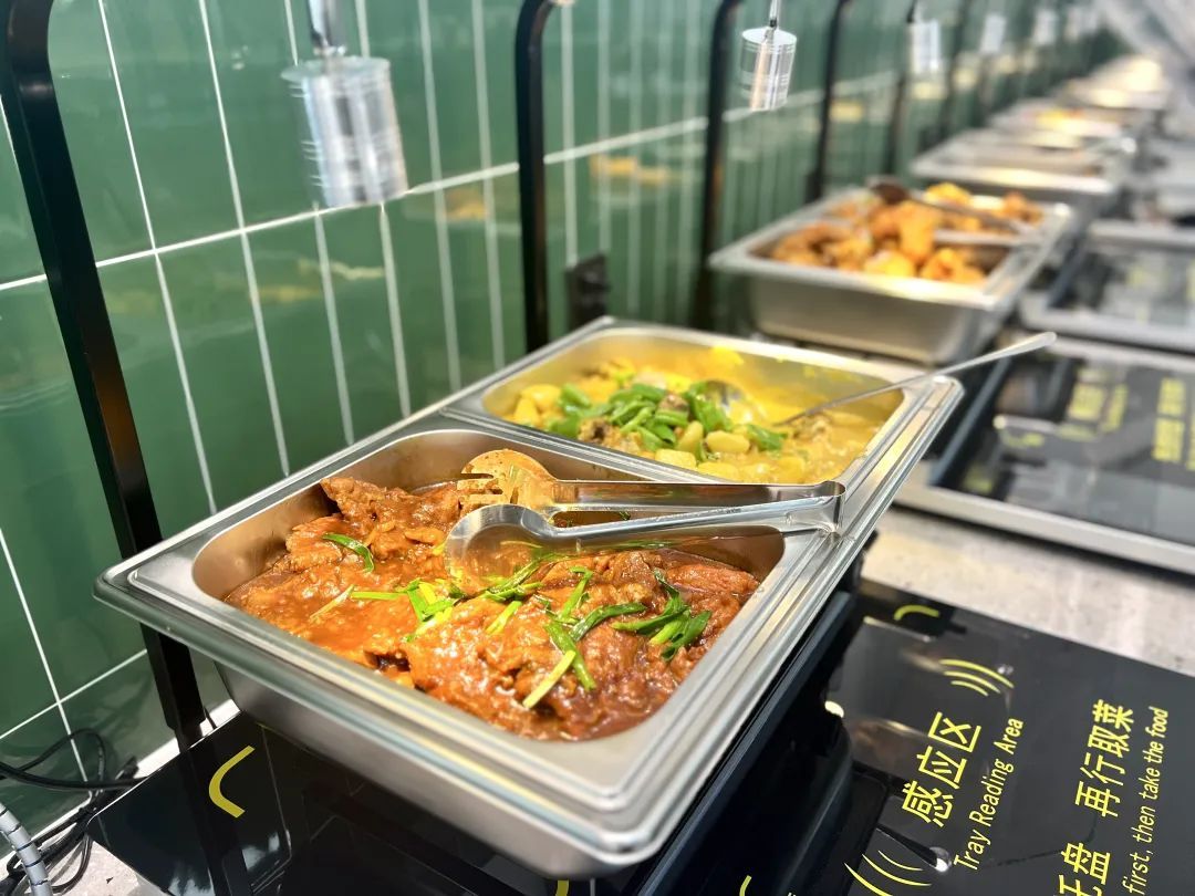 在选菜区域,装有咖喱土豆鸡块、葱烤大排、番茄炒蛋、肉末茄子、糖醋小排、上海青等菜品的“自助餐炉”一字排开。