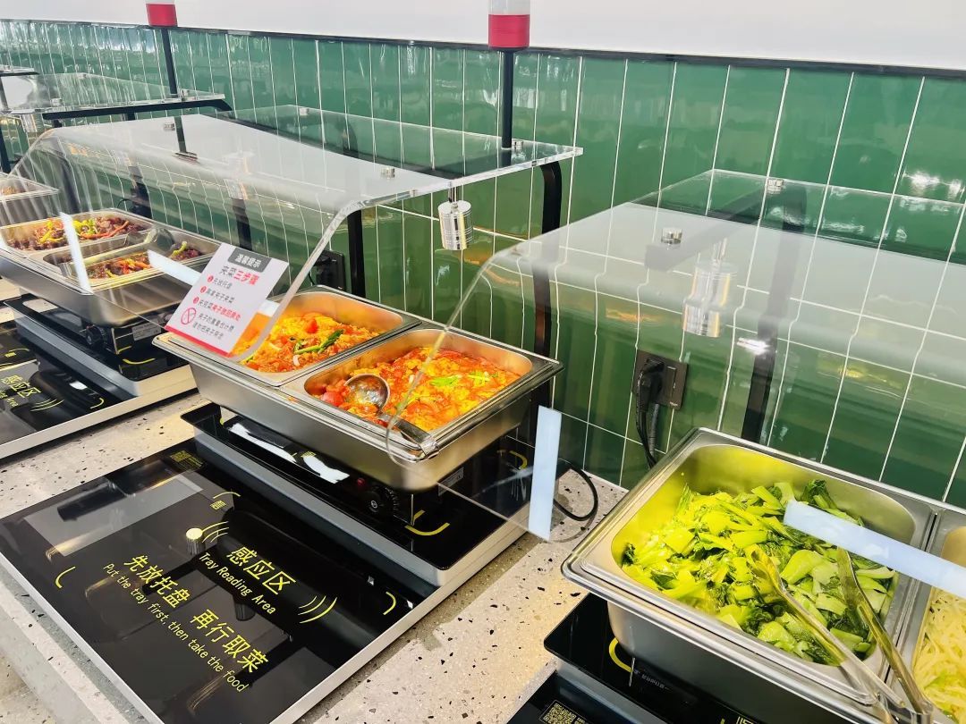 与市面上常见的“自助餐炉”不同,该食堂选用的“自助餐炉”名为自助称重计价取餐一体机,不仅有菜品恒温功能,而且还可通过灵敏传感器精准计重,并在显示屏上实时显示菜品名称、价格等信息。