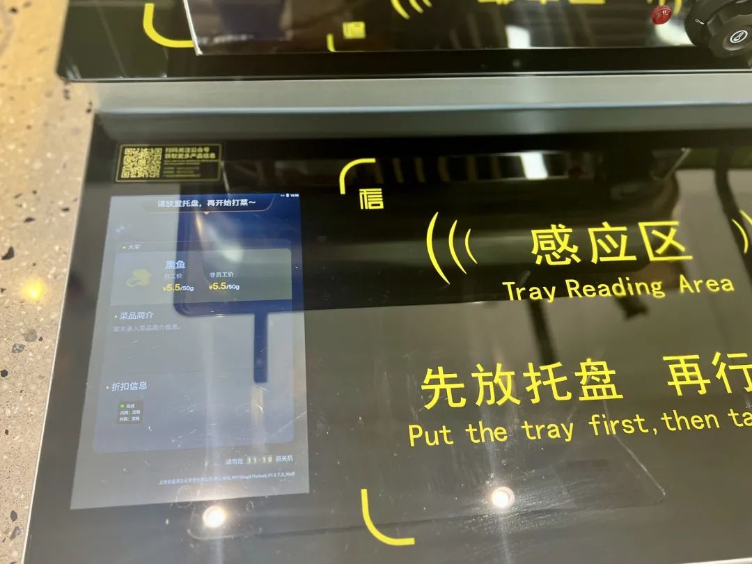 目前,该食堂在选菜区域配备了1台智能绑卡机、9台自助称重计价取餐一体机,以及1台人脸收银机,且所有的托盘均嵌有感应装置。