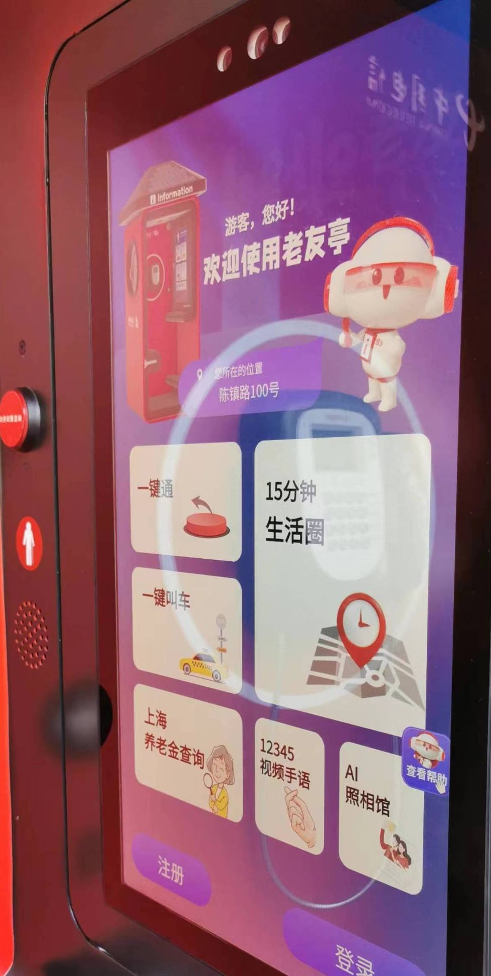 近日,这样一台拥有“超炫红衣”的数字全场景老年友好型公话亭亮相宝山多地。在罗泾镇陈镇路上的这台“Hello老友亭”是上海首批也是宝山区第一个升级改造的公话亭,已于今年4月下旬正式开通使用。它不仅外观时尚,“内在”也是大有看头,里面不仅有电话机还有智慧信息屏、读卡器、充电设备及助老人工服务等功能,融合AI、大数据、物联网认证等数字技术,为居民提供15分钟生活圈查询介绍、刷脸一键叫车、3分钟免费通话、养老金查询、免费充电、手语服务、AI照相馆、助老一键通等民生服务。现场,不太会使用智能手机的居民胡阿姨通过信息屏上的一键叫车服务实现了方便出行,操作简单又服务多样的新型公话亭让她欣喜不已。她表示:“我们老年人,不会手机叫车,现在在老友亭里一按就可以叫车,方便多了。”