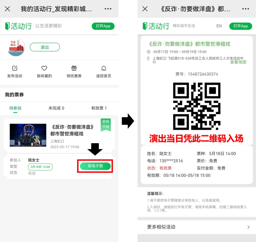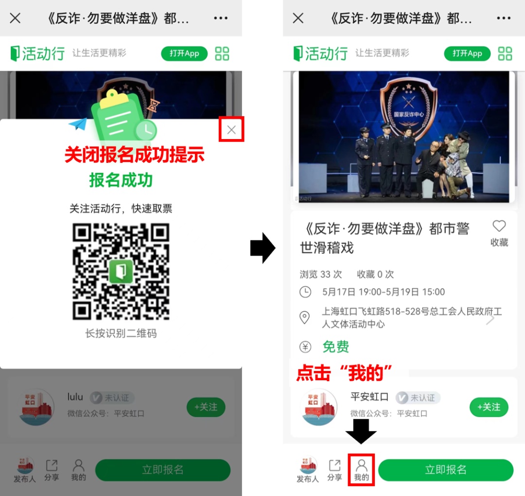 关闭报名成功提示窗口,在报名页面点击【我的-取电子票】即可获取入场二维码