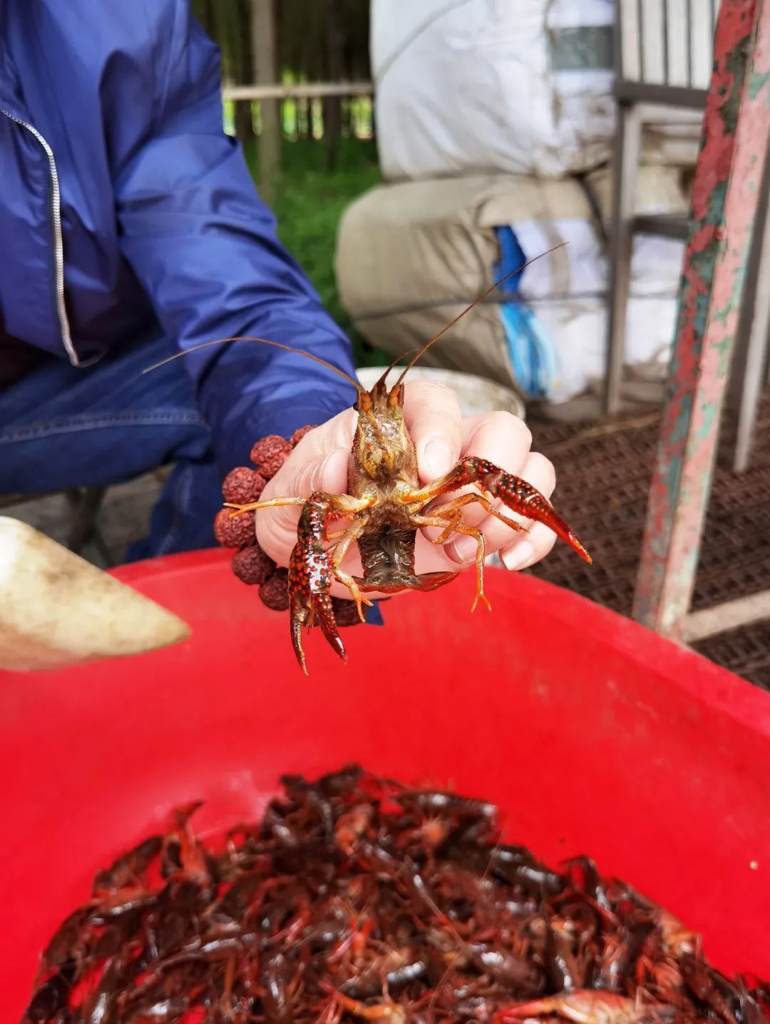 近日,记者探访了一家位于宝山罗泾的虾稻米基地,田间的水面下养殖着小龙虾。虾农用地笼捕捉小龙虾,满满的一笼重量有10余斤,外壳红彤彤的鲜活小龙虾挥舞着钳子,看起来充满活力。