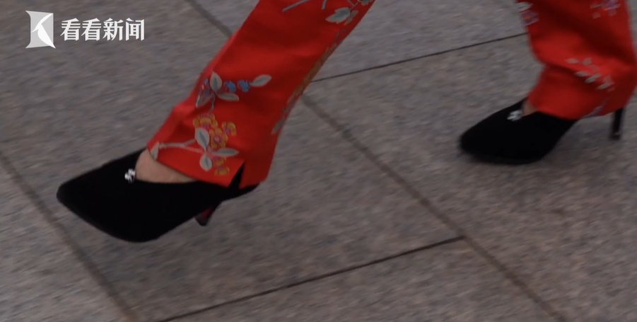 她曾把这双七厘米的黑色高跟鞋穿到了冰岛,搭配一件金色龙凤绣旗袍,走在异国的街头,吸引了不少北欧人与她合影。