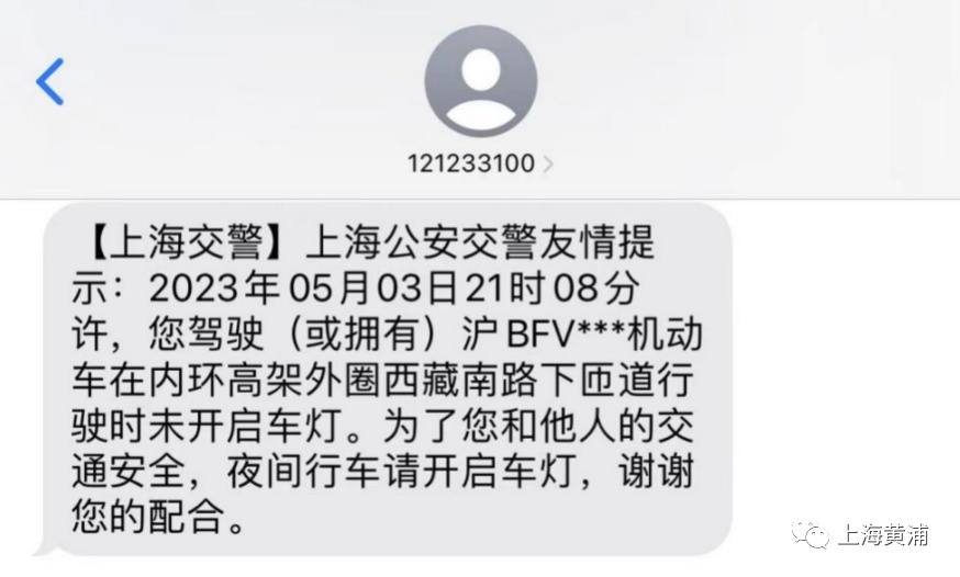 “上海交警交通安全提示:2023年5月3日21时08分许,您驾驶(或拥有)沪BFV***机动车在内环高架外圈西藏南路下匝道行驶时未开启车灯。为了您和他人的交通安全,夜间行车请开启车灯,谢谢您的配合。”近日,市民徐先生最近收到了一条上海交警发来的短信。