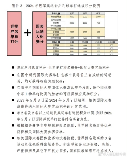 德班世乒赛即将开打,15日中国乒协在官网公示了《乒乓球项目2024巴黎奥运会参赛选拔办法》。